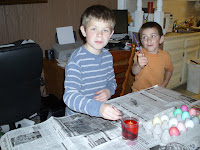 Easter kind of sneaked up on me this year. You'd think that being so late in the year, I'd be ready and waiting, but I guess not. Anyway, on Saturday once the chores were done we covered the table with newspaper and colored eggs.