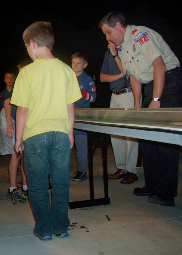 By tradition in this pack, the boys make the boats at the pack meeting out of simple materials - a Styrofoam base with a wooden dowel mast and a cardstock sail. They were simple, but they worked. The boys lined up at one end of the gutters, blew their boats to the end, then ran around to get back in line to race again. Steven served as assistant cubmaster, telling them when to start. ("Ready, Set, Blow!") Each of the boys made a boat and raced it, while Hannah staked out the dessert table, and helped take pictures. I watched and took a few pictures myself. Here are some of the pictures we took: